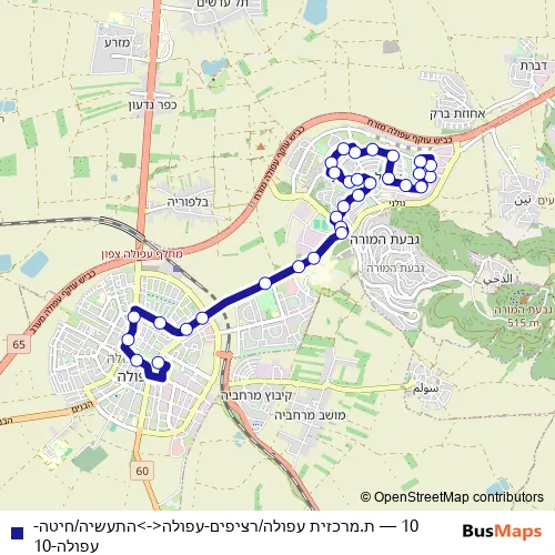 The first stop of the 10 bus route is התעשייה/החרט and the last stop is ת.מרכזית עפולה/הורדה. 10 (ת.מרכזית עפולה/רציפים-עפולה<->התעשיה/חיטה-עפולה-10) is operational during כל יום.