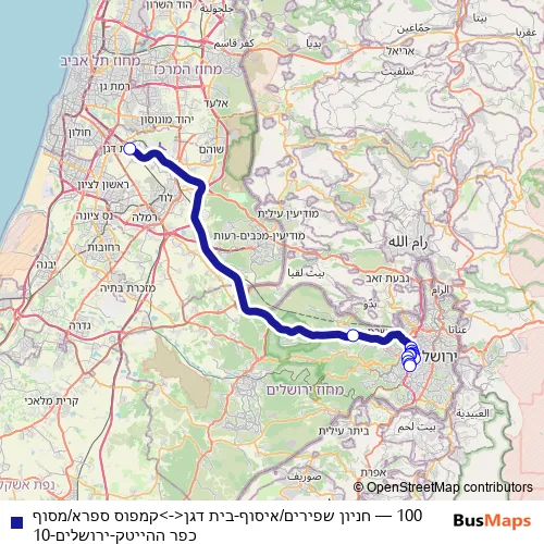 Click here to view the nearest 100 - חניון שפירים/איסוף-בית דגן<->קמפוס ספרא/מסוף כפר ההייטק-ירושלים-10 bus stop.