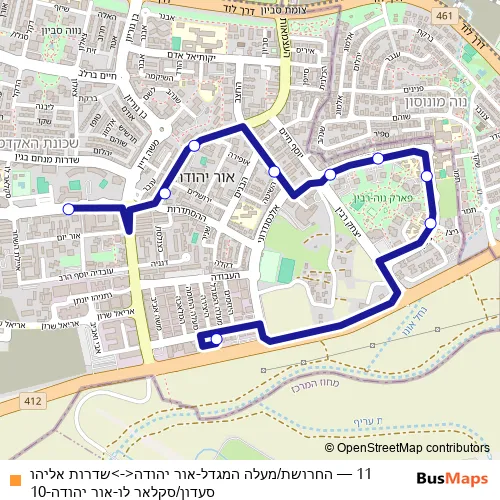 The first stop of the 11 bus route is עירייה/אליהו סעדון and the last stop is מסוף אור יהודה. 11 (החרושת/מעלה המגדל-אור יהודה<->שדרות אליהו סעדון/סקלאר לו-אור יהודה-10) is operational during כל יום.