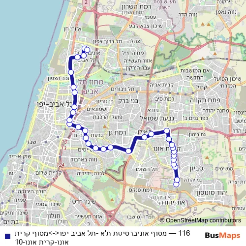 Bus 116 - מסוף אוניברסיטת ת'א -תל אביב יפו<->מסוף קרית אונו-קרית אונו-10 in Tel Aviv: Stops & Timetable