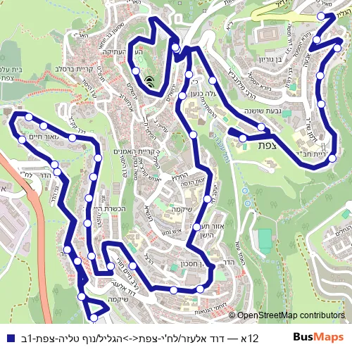 The first stop of the 12א bus route is דוד אלעזר/לח'י and the last stop is הגליל/נוף טליה. 12א (דוד אלעזר/לח'י-צפת<->הגליל/נוף טליה-צפת-1ב) is operational during כל יום.