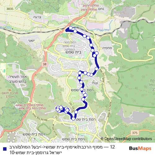 The first stop of the 12 bus route is מסוף הרכבת/איסוף and the last stop is בעל הסולם/הרב ישראל גרוסמן. 12 (מסוף הרכבת/איסוף-בית שמש<->בעל הסולם/הרב ישראל גרוסמן-בית שמש-10) is operational during כל יום.