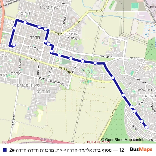The first stop of the 12 bus route is מסוף בית אליעזר and the last stop is ת. מרכזית חדרה. 12 (מסוף בית אליעזר-חדרה<->ת. מרכזית חדרה-חדרה-2#) is operational during כל יום.
