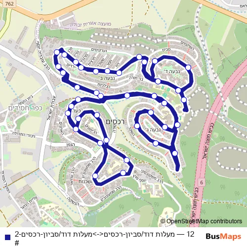 The first stop of the 12 bus route is מעלות דוד/סביון and the last stop is מעלות דוד/סביון. 12 (מעלות דוד/סביון-רכסים<->מעלות דוד/סביון-רכסים-2#) is operational during כל יום.