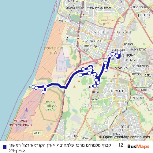 The first stop of the 12 bus route is קבוץ פלמחים מרכז and the last stop is עין הקורא/הרצל. 12 (קבוץ פלמחים מרכז-פלמחים<->עין הקורא/הרצל-ראשון לציון-24) is operational during כל יום.