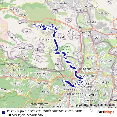 Bus 134 - תחנה תפעולית/ביטוח לאומי-ירושלים<->אגן האיילות/הר המוריה-גבעת זאב-1# in Jerusalem: Stops & Timetable