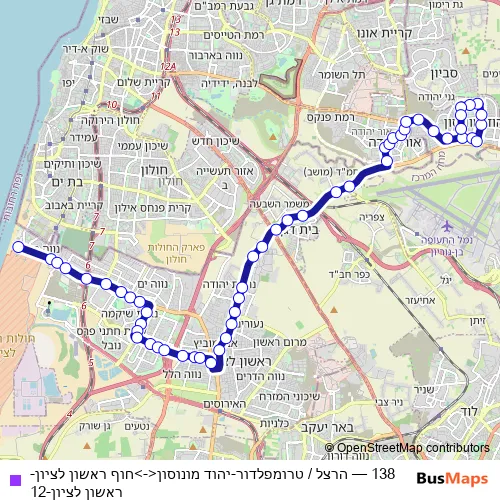 The first stop of the 138 bus route is הרצל / טרומפלדור and the last stop is חוף ראשון לציון. 138 (הרצל / טרומפלדור-יהוד מונוסון<->חוף ראשון לציון-ראשון לציון-12) is operational during בסופי שבוע.