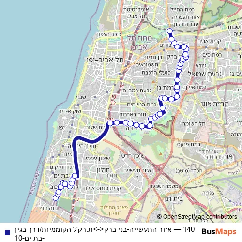 The first stop of the 140 bus route is ת.רק'ל הקוממיות/דרך בגין and the last stop is אזור התעשייה. 140 (אזור התעשייה-בני ברק<->ת.רק'ל הקוממיות/דרך בגין-בת ים-10) is operational during כל יום.