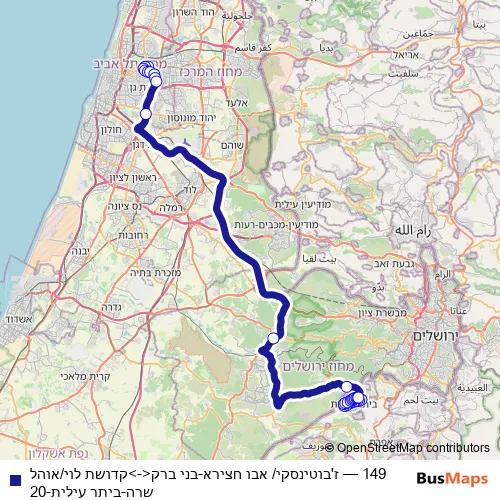 Bus 149 - ז'בוטינסקי/ אבו חצירא-בני ברק<->קדושת לוי/אוהל שרה-ביתר עילית-20 in Jerusalem: Stops & Timetable