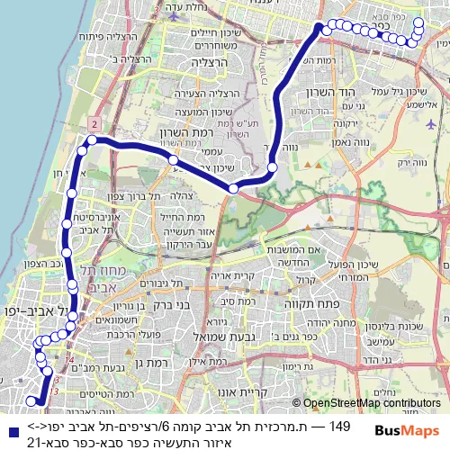The first stop of the 149 bus route is ת.מרכזית תל אביב קומה 6/רציפים and the last stop is איזור התעשיה כפר סבא. 149 (ת.מרכזית תל אביב קומה 6/רציפים-תל אביב יפו<->איזור התעשיה כפר סבא-כפר סבא-21) is operational during כל יום.