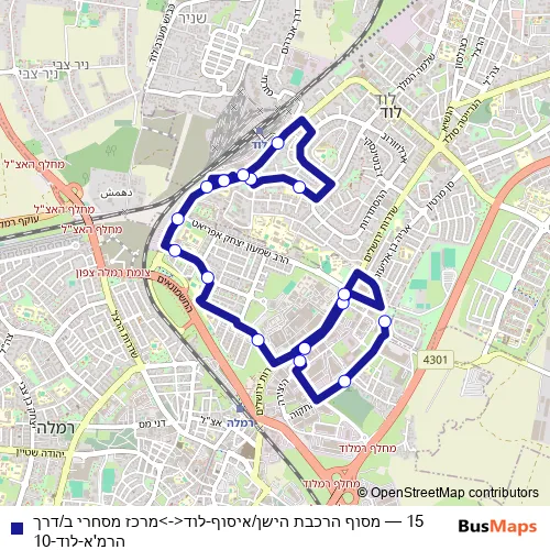 The first stop of the 15 bus route is מסוף הרכבת הישן/איסוף and the last stop is מרכז מסחרי ב/דרך הרמ'א. 15 (מסוף הרכבת הישן/איסוף-לוד<->מרכז מסחרי ב/דרך הרמ'א-לוד-10) is operational during כל יום.