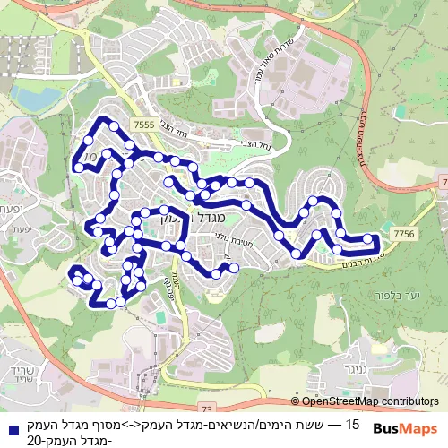 The first stop of the 15 bus route is ששת הימים/הנשיאים and the last stop is מסוף מגדל העמק. 15 (ששת הימים/הנשיאים-מגדל העמק<->מסוף מגדל העמק-מגדל העמק-20) is operational during כל יום.