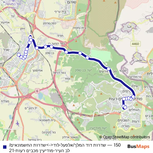 The first stop of the 150 bus route is שדרות דוד המלך/אלפעל and the last stop is שדרות החשמונאים/לב העיר. 150 (שדרות דוד המלך/אלפעל-לוד<->שדרות החשמונאים/לב העיר-מודיעין מכבים רעות-21) is operational during כל יום.