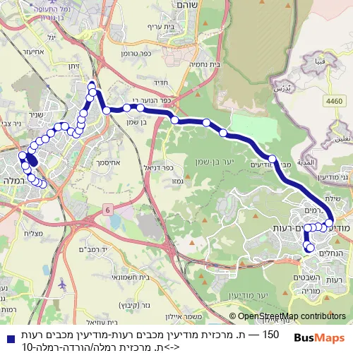 The first stop of the 150 bus route is ת. מרכזית רמלה and the last stop is שדרות החשמונאים/לב העיר. 150 (ת. מרכזית מודיעין מכבים רעות-מודיעין מכבים רעות<->ת. מרכזית רמלה/הורדה-רמלה-10) is operational during כל יום.
