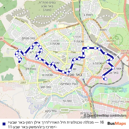 Bus 16 - מכללה טכנולוגית חיל האוויר/דרך אילן רמון-באר שבע<->מרכז ביג/המשק-באר שבע-11 Schedule in Beersheba
