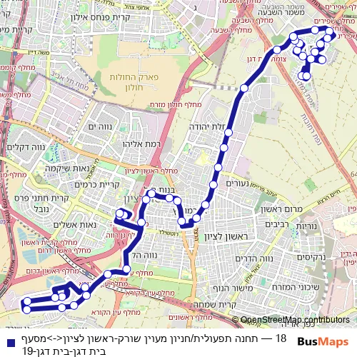 The first stop of the 18 bus route is תחנה תפעולית/חניון מעוין שורק and the last stop is מסעף בית דגן. 18 (תחנה תפעולית/חניון מעוין שורק-ראשון לציון<->מסעף בית דגן-בית דגן-19) is operational during כל יום.