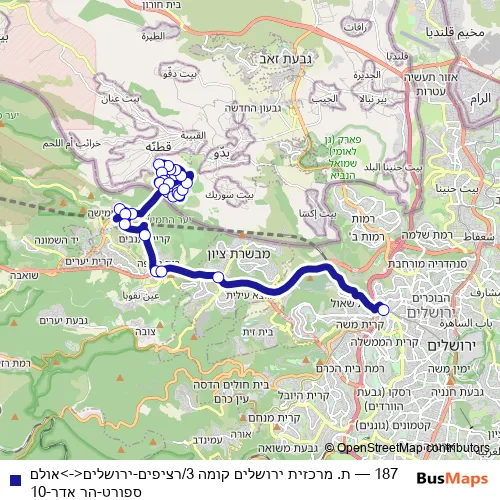 The first stop of the 187 bus route is אולם ספורט and the last stop is ת. מרכזית ירושלים/הורדה. 187 (ת. מרכזית ירושלים קומה 3/רציפים-ירושלים<->אולם ספורט-הר אדר-10) is operational during כל יום.
