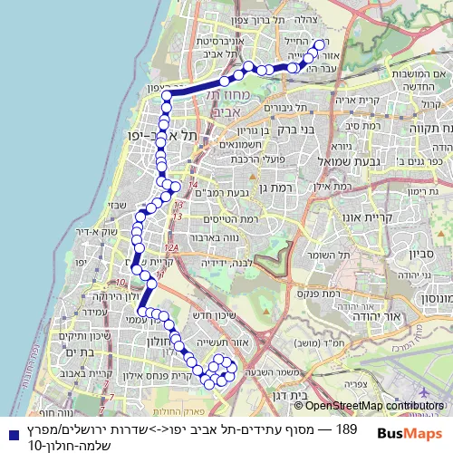 The first stop of the 189 bus route is מסוף עתידים and the last stop is שדרות ירושלים/מפרץ שלמה. 189 (מסוף עתידים-תל אביב יפו<->שדרות ירושלים/מפרץ שלמה-חולון-10) is operational during כל יום.