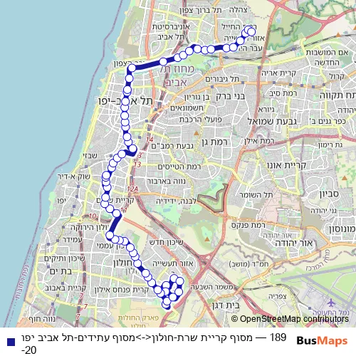 The first stop of the 189 bus route is מסוף קריית שרת and the last stop is מסוף עתידים. 189 (מסוף קריית שרת-חולון<->מסוף עתידים-תל אביב יפו-20) is operational during כל יום.