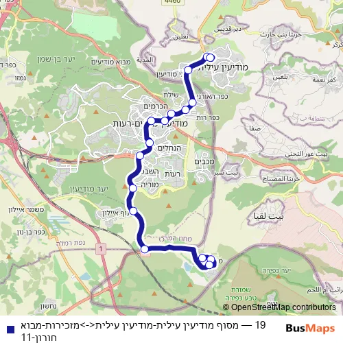 The first stop of the 19 bus route is חומש/יפה נוף and the last stop is מסוף מודיעין עילית/הורדה. 19 (מסוף מודיעין עילית-מודיעין עילית<->מזכירות-מבוא חורון-11) is operational during כל יום.