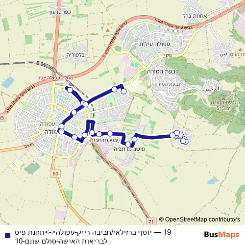 The first stop of the 19 bus route is סולם שונם and the last stop is מרכז מסחרי/יוסף ברזילי. 19 (יוסף ברזילאי/חביבה רייק-עפולה<->תחנת פיס לבריאות האישה-סולם שונם-10) is operational during כל יום.