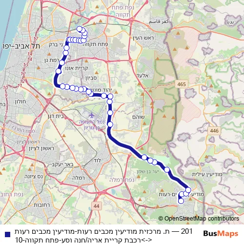 Bus 201 - ת. מרכזית מודיעין מכבים רעות-מודיעין מכבים רעות<->רכבת קריית אריה/חנה וסע-פתח תקווה-10 in Tel Aviv: Stops & Timetable
