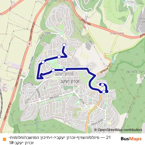 The first stop of the 21 bus route is פינלס/השזיף and the last stop is תיכון המושבה/חלומות. 21 (פינלס/השזיף-זכרון יעקב<->תיכון המושבה/חלומות-זכרון יעקב-1#) is operational during כל יום.