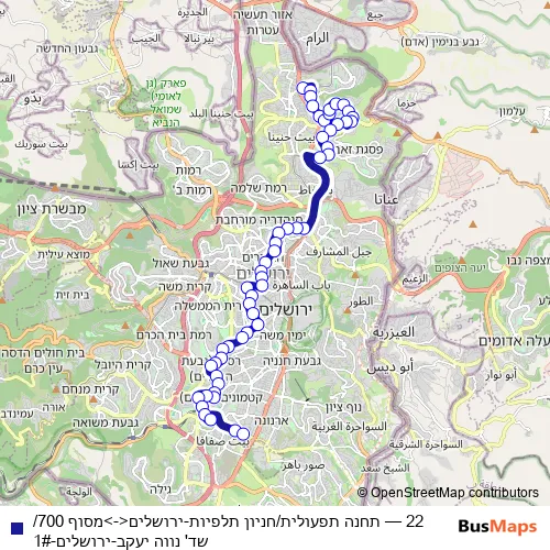 See why over 2 million users trust and consider busmaps.com as the best public transport website. busmaps gives you Jerusalem Buses suggested routes, real-time bus tracker, line route maps in Jerusalem, and helps to find the closest 22 bus stops near you. No internet available? Download an offline PDF map and bus schedule for the 22 bus to take on your trip.