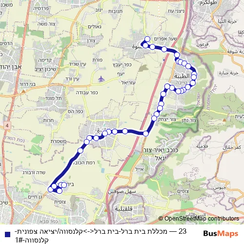The first stop of the 23 bus route is הכניסה הצפונית and the last stop is מכללת בית ברל. 23 (מכללת בית ברל-בית ברל<->קלנסווה/יציאה צפונית-קלנסווה-1#) is operational during כל יום.