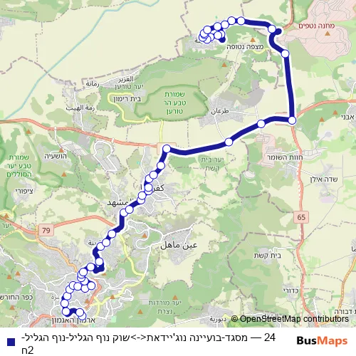 The first stop of the 24 bus route is שוק נוף הגליל and the last stop is בזק. 24 (מסגד-בועיינה נוג'יידאת<->שוק נוף הגליל-נוף הגליל-2ח) is operational during כל יום.