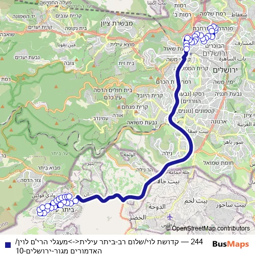 The first stop of the 244 bus route is מעגלי הרי'ם לוין/האדמורים מגור and the last stop is קדושת לוי/אוהל שרה. 244 (קדושת לוי/שלום רב-ביתר עילית<->מעגלי הרי'ם לוין/האדמורים מגור-ירושלים-10) is operational during כל יום.