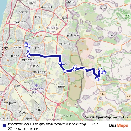 Bus 257 - עמל/שלמה מיכאליס-פתח תקווה<->לבונה/שדרות ניצנים-בית אריה-20 in Ariel: Stops & Timetable