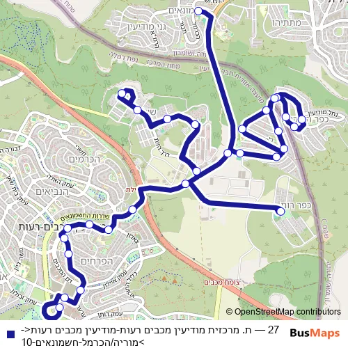 The first stop of the 27 bus route is מוריה/הכרמל and the last stop is שדרות החשמונאים/לב העיר. 27 (ת. מרכזית מודיעין מכבים רעות-מודיעין מכבים רעות<->מוריה/הכרמל-חשמונאים-10) is operational during כל יום.