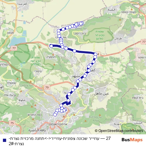 The first stop of the 27 bus route is עוזייר שכונה צפונית and the last stop is תחנה מרכזית נצרת. 27 (עוזייר שכונה צפונית-עוזייר<->תחנה מרכזית נצרת-נצרת-2#) is operational during כל יום.