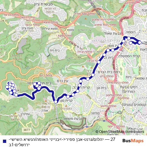 See why over 2 million users trust and consider busmaps.com as the best public transport website. busmaps gives you Jerusalem Buses suggested routes, real-time bus tracker, line route maps in Jerusalem, and helps to find the closest 27 bus stops near you. No internet available? Download an offline PDF map and bus schedule for the 27 bus to take on your trip.