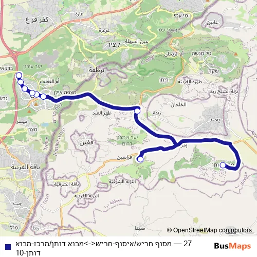 The first stop of the 27 bus route is מבוא דותן/מרכז and the last stop is מסוף חריש/הורדה. 27 (מסוף חריש/איסוף-חריש<->מבוא דותן/מרכז-מבוא דותן-10) is operational during כל יום.