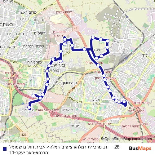 The first stop of the 28 bus route is ת. מרכזית רמלה/רציפים and the last stop is בית חולים שמואל הרופא. 28 (ת. מרכזית רמלה/רציפים-רמלה<->בית חולים שמואל הרופא-באר יעקב-11) is operational during כל יום.