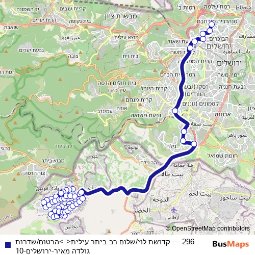 The first stop of the 296 bus route is קדושת לוי/שלום רב and the last stop is הרטום/שדרות גולדה מאיר. 296 (קדושת לוי/שלום רב-ביתר עילית<->הרטום/שדרות גולדה מאיר-ירושלים-10) is operational during כל יום.