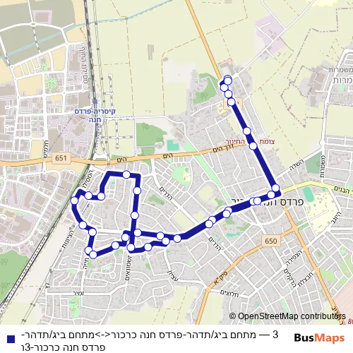 The first stop of the 3 bus route is מתחם ביג/תדהר and the last stop is מתחם ביג/תדהר. 3 (מתחם ביג/תדהר-פרדס חנה כרכור<->מתחם ביג/תדהר-פרדס חנה כרכור-3ו) is operational during כל יום.