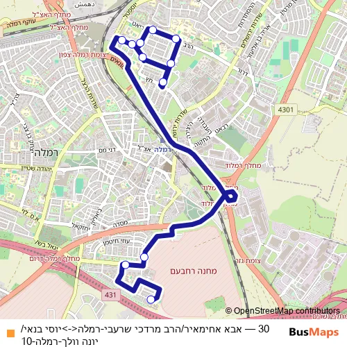 The first stop of the 30 bus route is יוסי בנאי/יונה וולך and the last stop is אחימאיר/שרעבי. 30 (אבא אחימאיר/הרב מרדכי שרעבי-רמלה<->יוסי בנאי/יונה וולך-רמלה-10) is operational during כל יום.