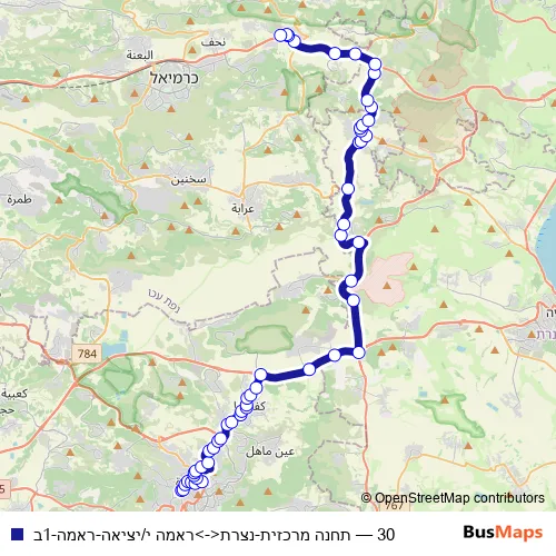 The first stop of the 30 bus route is תחנה מרכזית and the last stop is ראמה י/יציאה. 30 (תחנה מרכזית-נצרת<->ראמה י/יציאה-ראמה-1ב) is operational during כל יום.