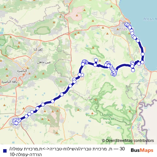 The first stop of the 30 bus route is ת. מרכזית טבריה/השילוח and the last stop is ת.מרכזית עפולה/הורדה. 30 (ת. מרכזית טבריה/השילוח-טבריה<->ת.מרכזית עפולה/הורדה-עפולה-10) is operational during כל יום.