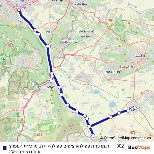 The first stop of the 302 bus route is ת.מרכזית עפולה/רציפים and the last stop is ת. מרכזית המפרץ/הורדה. 302 (ת.מרכזית עפולה/רציפים-עפולה<->ת. מרכזית המפרץ/הורדה-חיפה-20) is operational during כל יום.