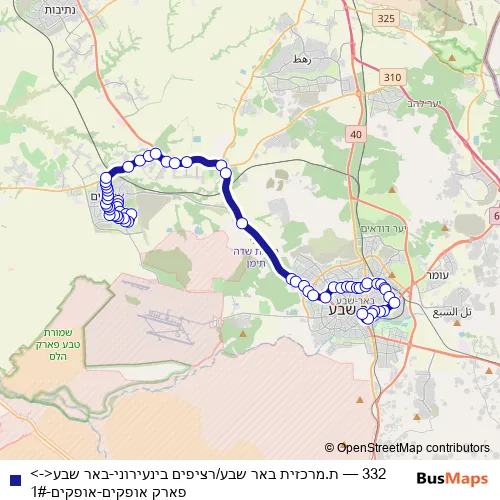 Services on the 332 - ת.מרכזית באר שבע/רציפים בינעירוני-באר שבע<->פארק אופקים-אופקים-1# bus stop at 18:54 on יום שני, יום שלישי, יום רביעי, יום חמישי, יום שישי, יום ראשון.