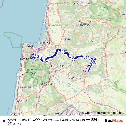 The first stop of the 334 bus route is אוניברסיטה/רב תכליתי and the last stop is בי'ח סעודי הגליל. 334 (אוניברסיטה/רב תכליתי-חיפה<->בי'ח סעודי הגליל-ריינה-2#) is operational during כל יום.
