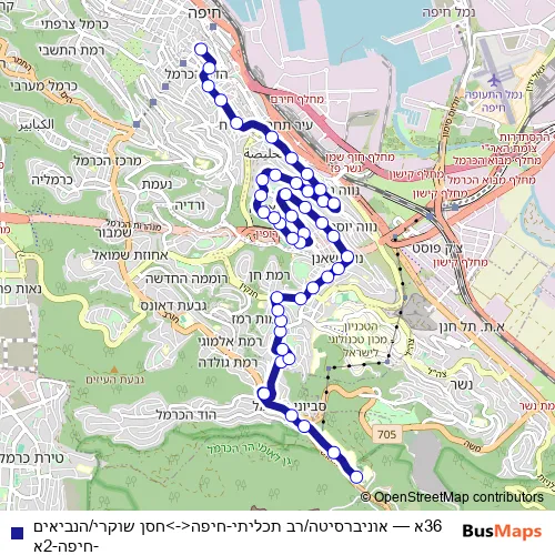 The first stop of the 36א bus route is אוניברסיטה/רב תכליתי and the last stop is חסן שוקרי/הנביאים. 36א (אוניברסיטה/רב תכליתי-חיפה<->חסן שוקרי/הנביאים-חיפה-2א) is operational during כל יום.