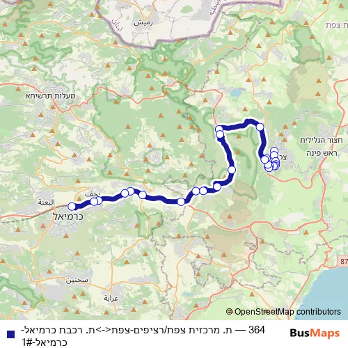 The first stop of the 364 bus route is ת. מרכזית צפת/רציפים and the last stop is ת. רכבת כרמיאל. 364 (ת. מרכזית צפת/רציפים-צפת<->ת. רכבת כרמיאל-כרמיאל-1#) is operational during כל יום.