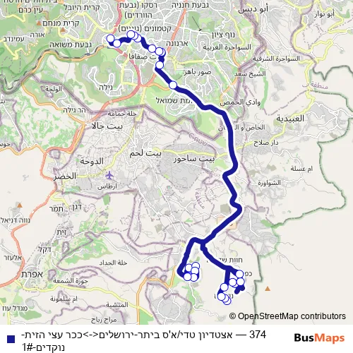 The first stop of the 374 bus route is ככר עצי הזית and the last stop is אצטדיון טדי/א'ס ביתר. 374 (אצטדיון טדי/א'ס ביתר-ירושלים<->ככר עצי הזית-נוקדים-1#) is operational during כל יום.
