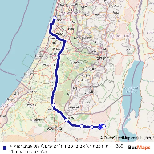 The first stop of the 389 bus route is ת. רכבת תל אביב- סבידור/רציפים A and the last stop is מלון יפה נוף. 389 (ת. רכבת תל אביב- סבידור/רציפים A-תל אביב יפו<->מלון יפה נוף-ערד-1ז) is operational during כל יום.