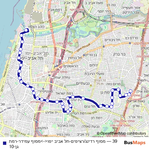 The first stop of the 39 bus route is מסוף עמידר and the last stop is מסוף רדינג/הורדה. 39 (מסוף רדינג/רציפים-תל אביב יפו<->מסוף עמידר-רמת גן-10) is operational during כל יום.